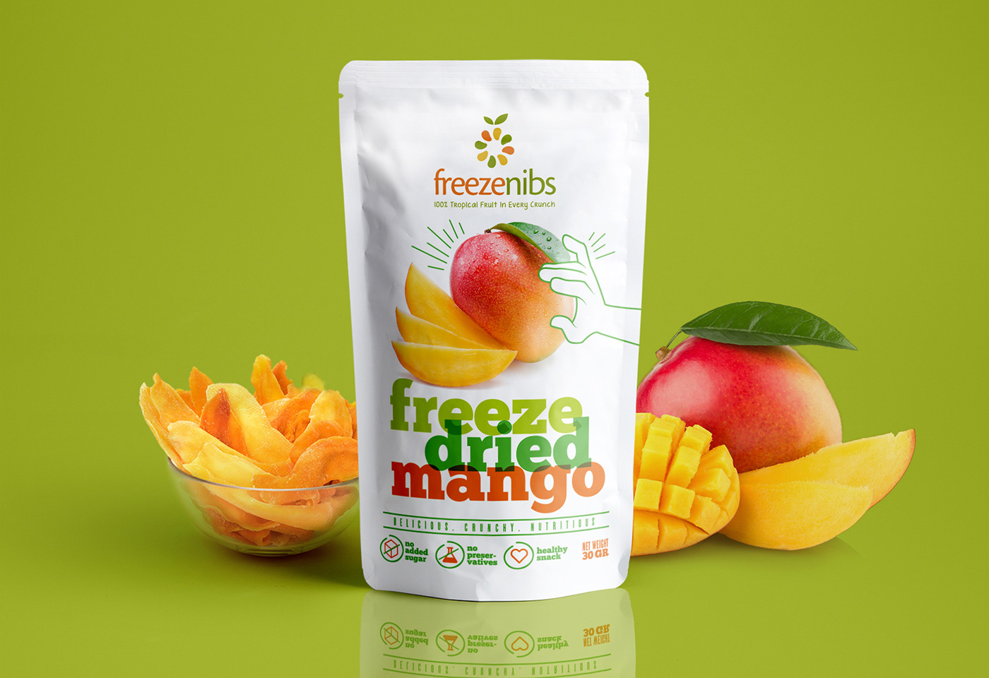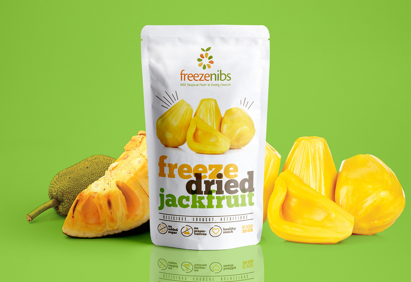 Logo and packaging design for a Thailand-based brand specializing in tropical, exotic freeze-dried fruits.